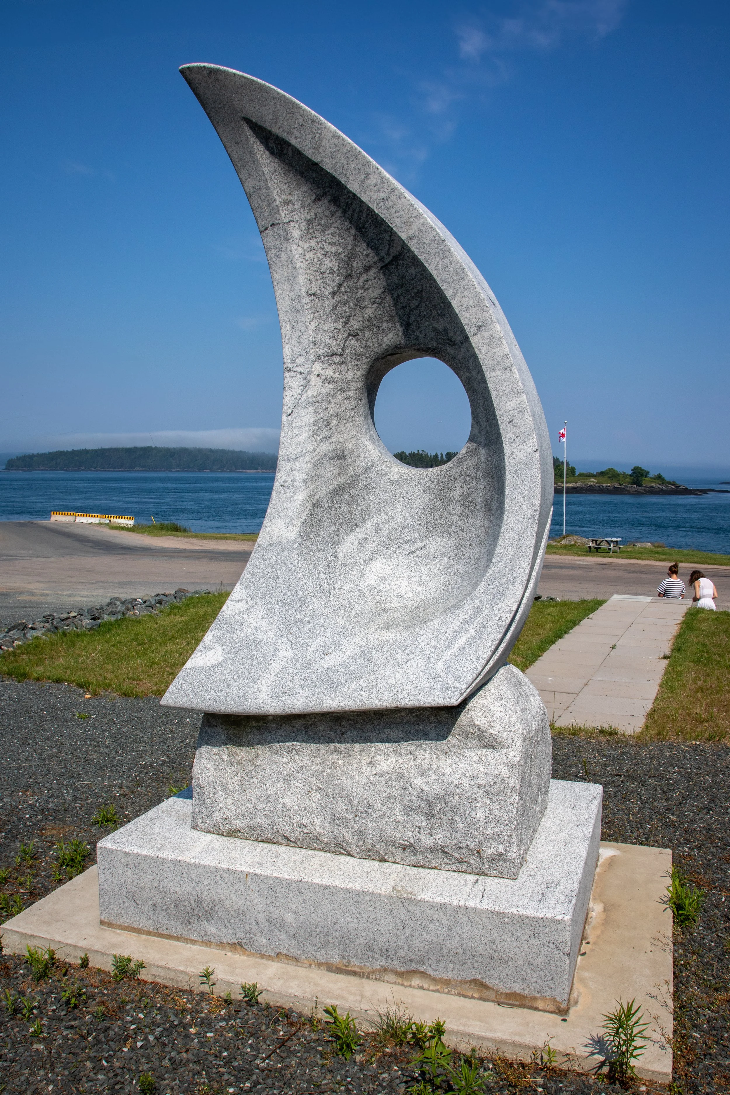 Before you head back to the mainland, stop across from the ferry landing to see Jim Boydโs 2022 granite sail sculpture, part of the International Sculpture Trail. Titled Fundy Spirit, Boyd explains his vision: โThe sail has 3 slightly raised fluid forms that spiral into a hole within the sail. For me, these forms represent the famous tidal whirlpool off the coast of Deer Island known as Old Sow. The hole through the sail also serves as a sort of port hole looking out onto the Bay of Fundy. The inside of the sail has a smoother polish than other areas of the sculpture, possibly evoking the feel of the inside of a shell.โ