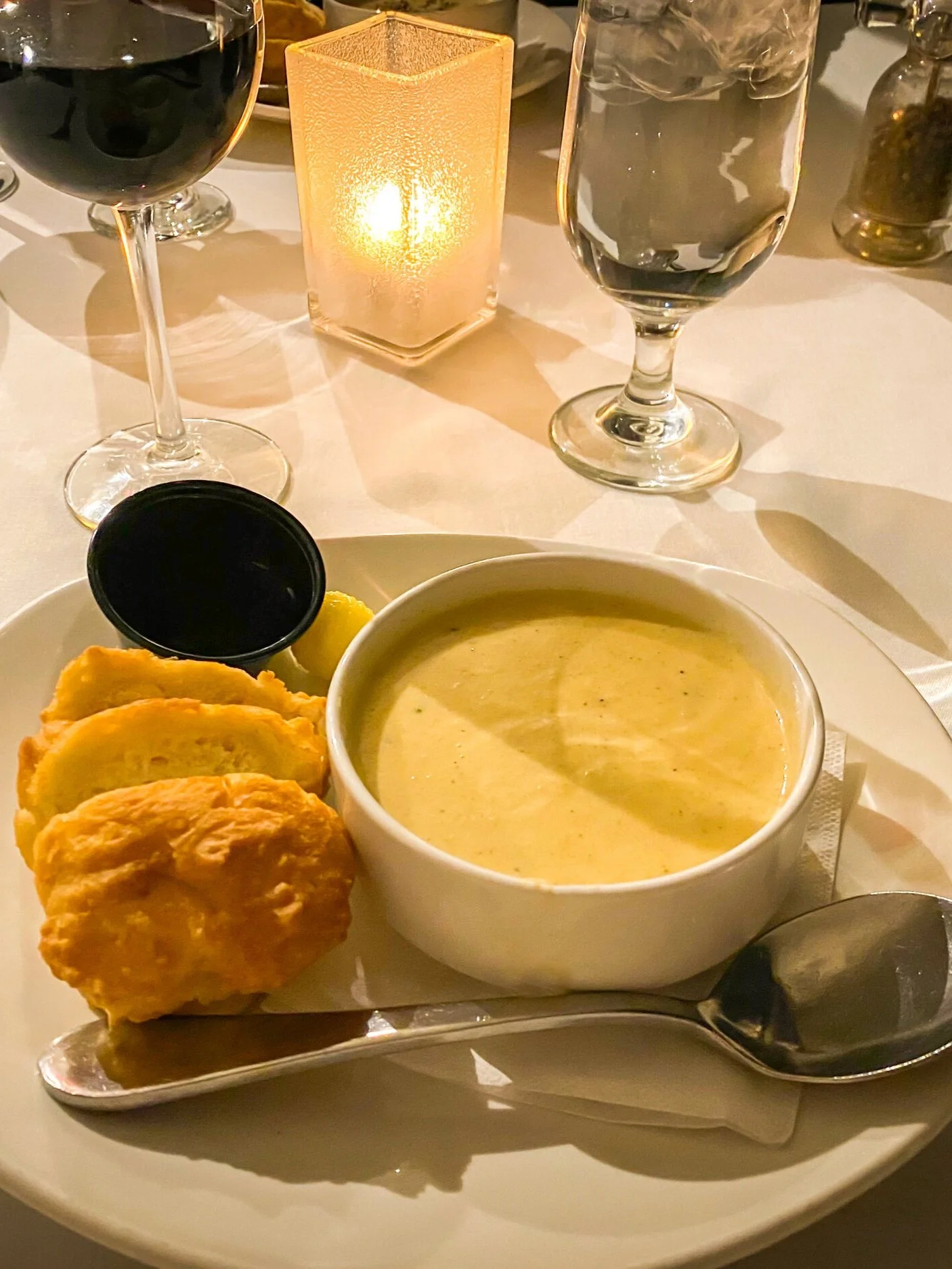 Everything was scrumptious at Wolastoq Wharf during my first Dine Around Freddy dinner here in 2020, from the delicious pear and brie soup, served with their signature freshly baked Bannock (with a side of butter and molasses), to our Seafood Fettuccine, followed by the decadent Chocolate Baileys Crรจme Brรปlรฉeโ dessert. Laurie and I were both drawn to this lineup, but there were other options, too, including a Spinach Salad with Bacon Dressing as a starter, Jambalaya for another main option, and a New York Style Cheesecake for dessert, which all sounded equally amazing. I was not surprised at all as Wolastoq Wharf is one of my favourite restaurants in Fredericton! For more information on Wolastoq Wharf and their 2025 Dine Around Freddy offerings see links at end of this article.
