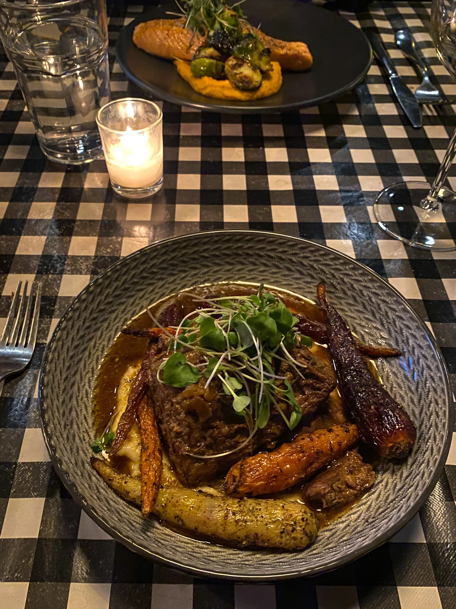 For our mains, I opted for the Pan-Seared Faroe Island Salmon, served with brussels sprout hearts, whipped squash, crรจme fraรฎche, candied lemon, and a garnish of microgreens. The salmon was perfectly cookedโtender, flaky, and rich with flavour. Eric was in his happy place with the Red Wine Roast Beef, paired with whipped truffle-herbed potatoes, heirloom carrots au jus. The Mmmโs that escaped him after the first bite made it clear this dish was a definite winner.