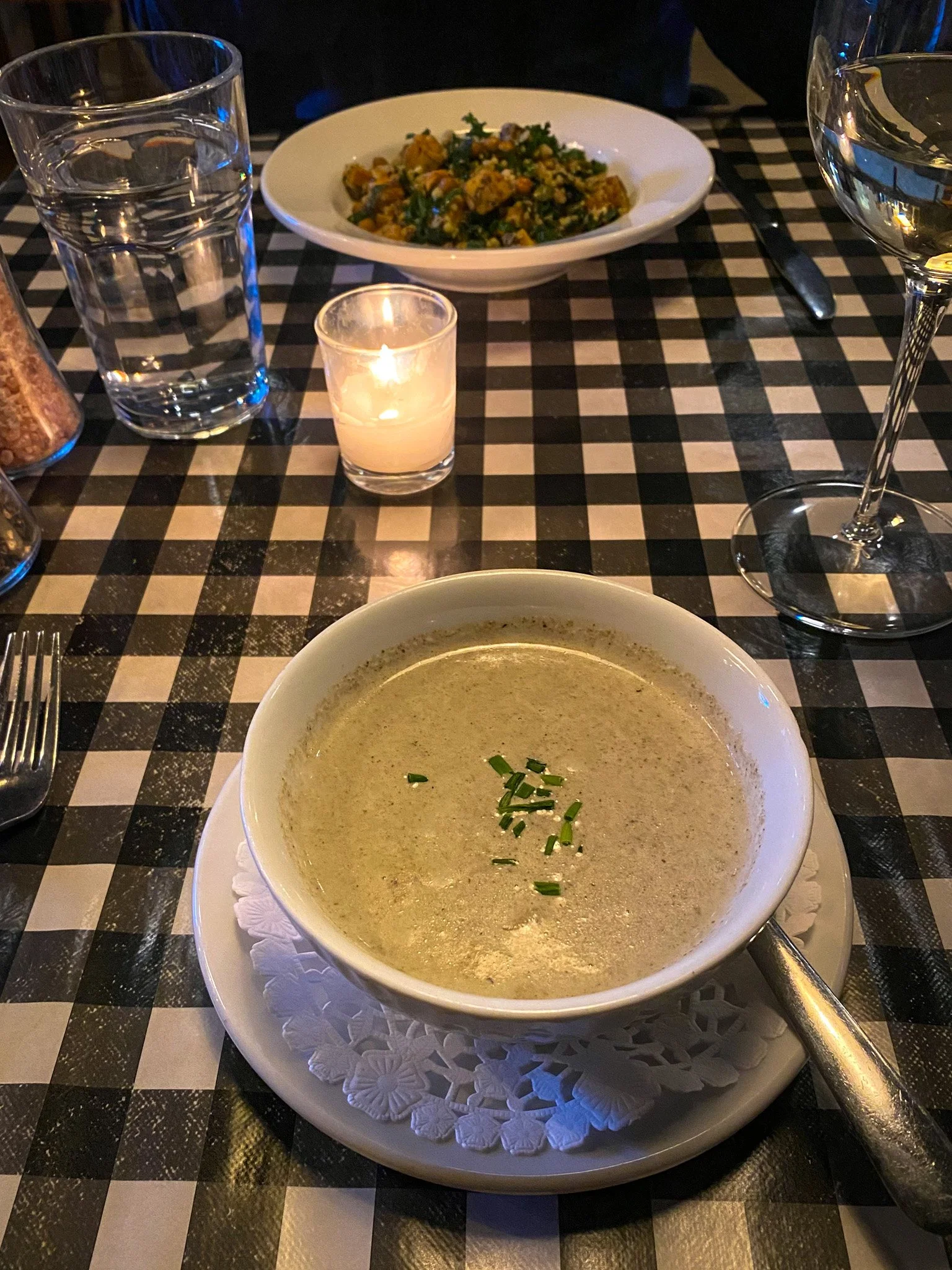 So, when I was invited to try Claudineโs 2025 Dine Around Freddy offering, I was thrilled. My husband, Eric, and I were ready to dive into yet another memorable experience. To start, I went straight for the Wild Mushroom Soup - a rich, earthy blend of wild mushrooms slow-cooked with herbs and finished with cream. A drizzle of truffle oil and a sprinkle of fresh chives took it to another level. Eric opted for the Kale Salad, packed with quinoa, roasted tempeh, crispy chickpeas, and sweet potato, all dressed in a tangy Tahini Dijon. I had to steal a few bites, and Iโd highly recommend it, too!