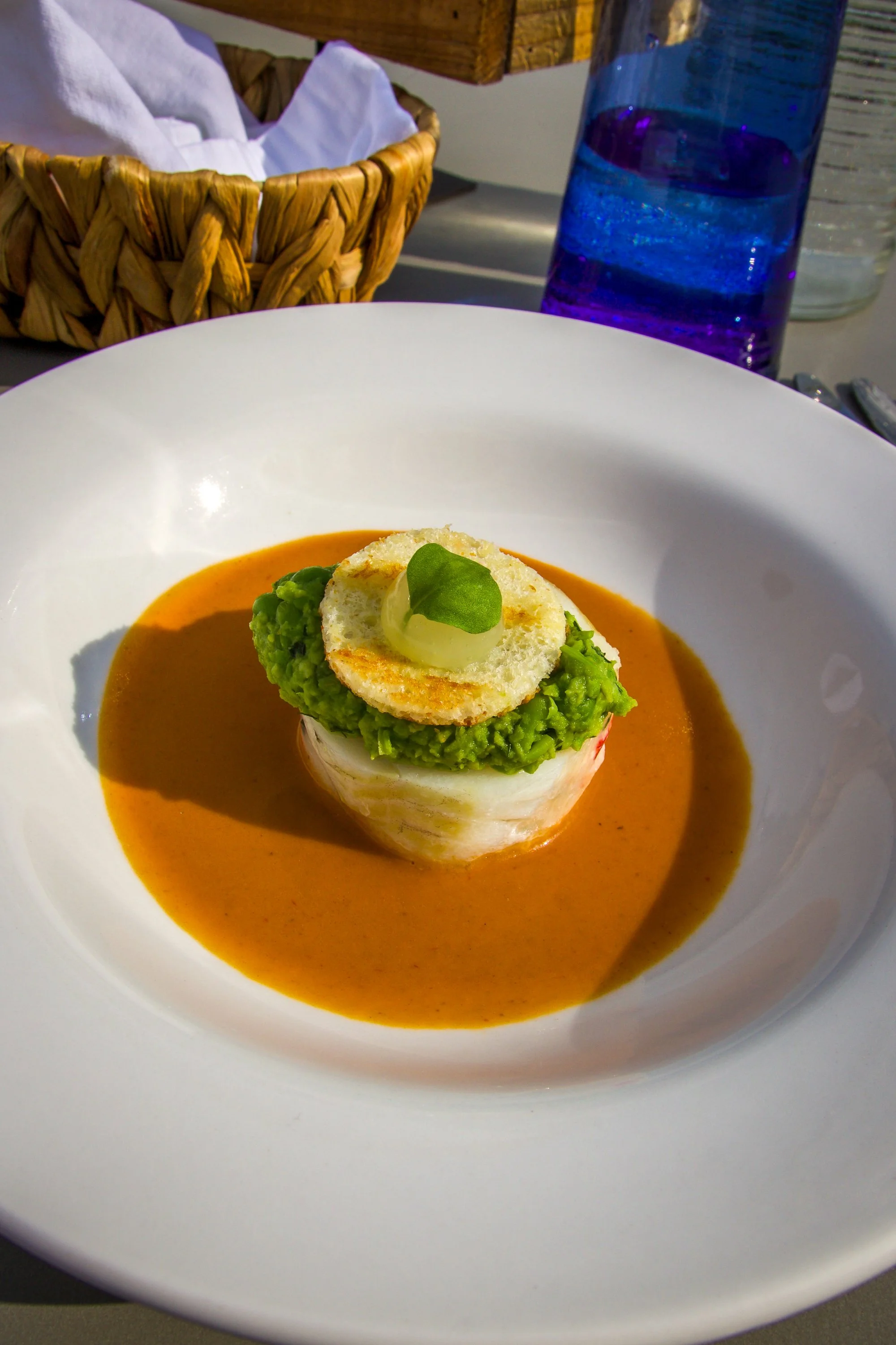 Chef Jordanโs fresh baguette with Sea Truffle butter, Newfoundland cod with scallop and lobster mousseline, lobster cream, mushy peas, brioche croutons, and lemon gel