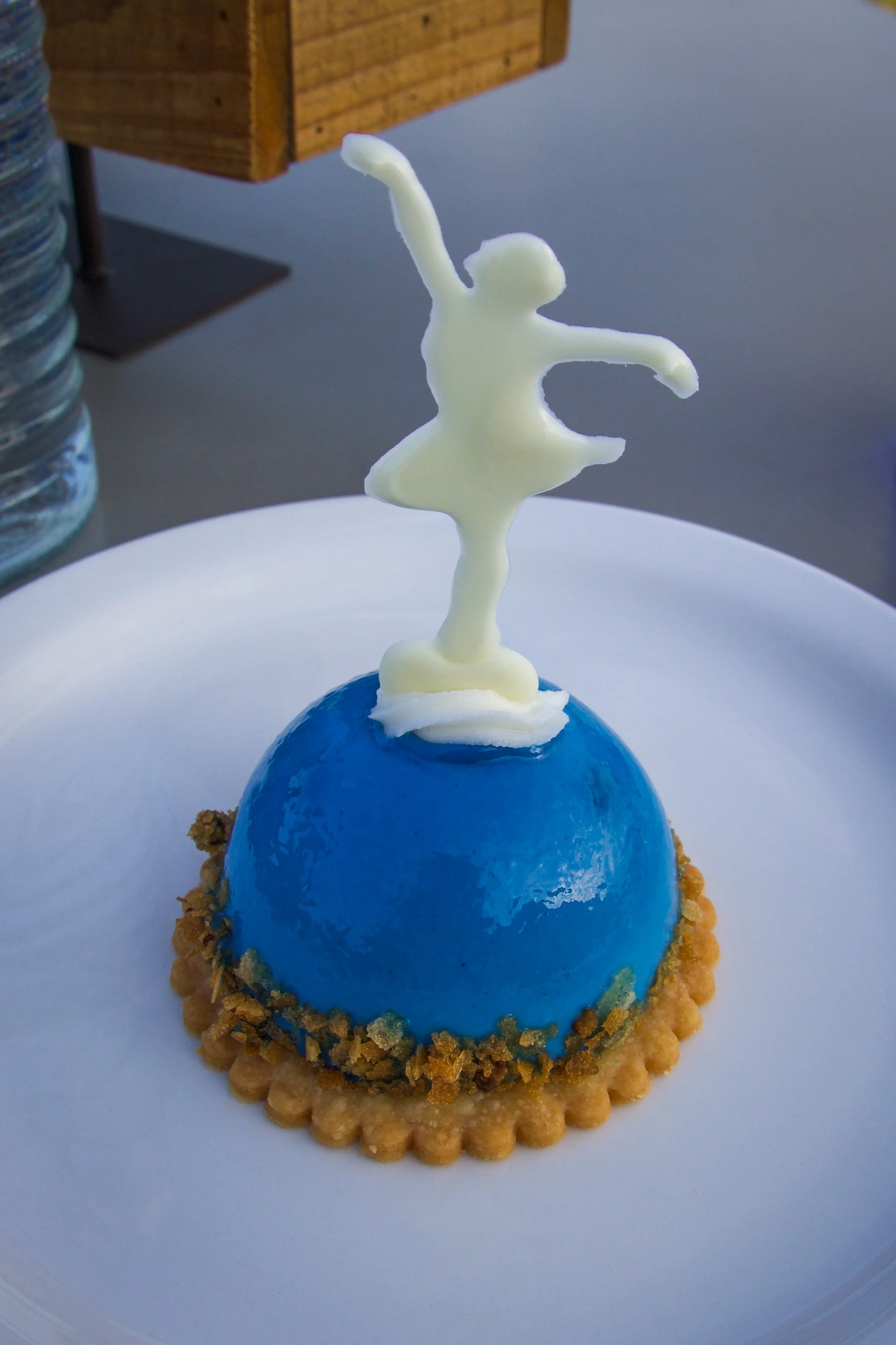 Chef Jordanโs Star anise Bavarian cream, blueberries, caramelized rice crispies, and white chocolate