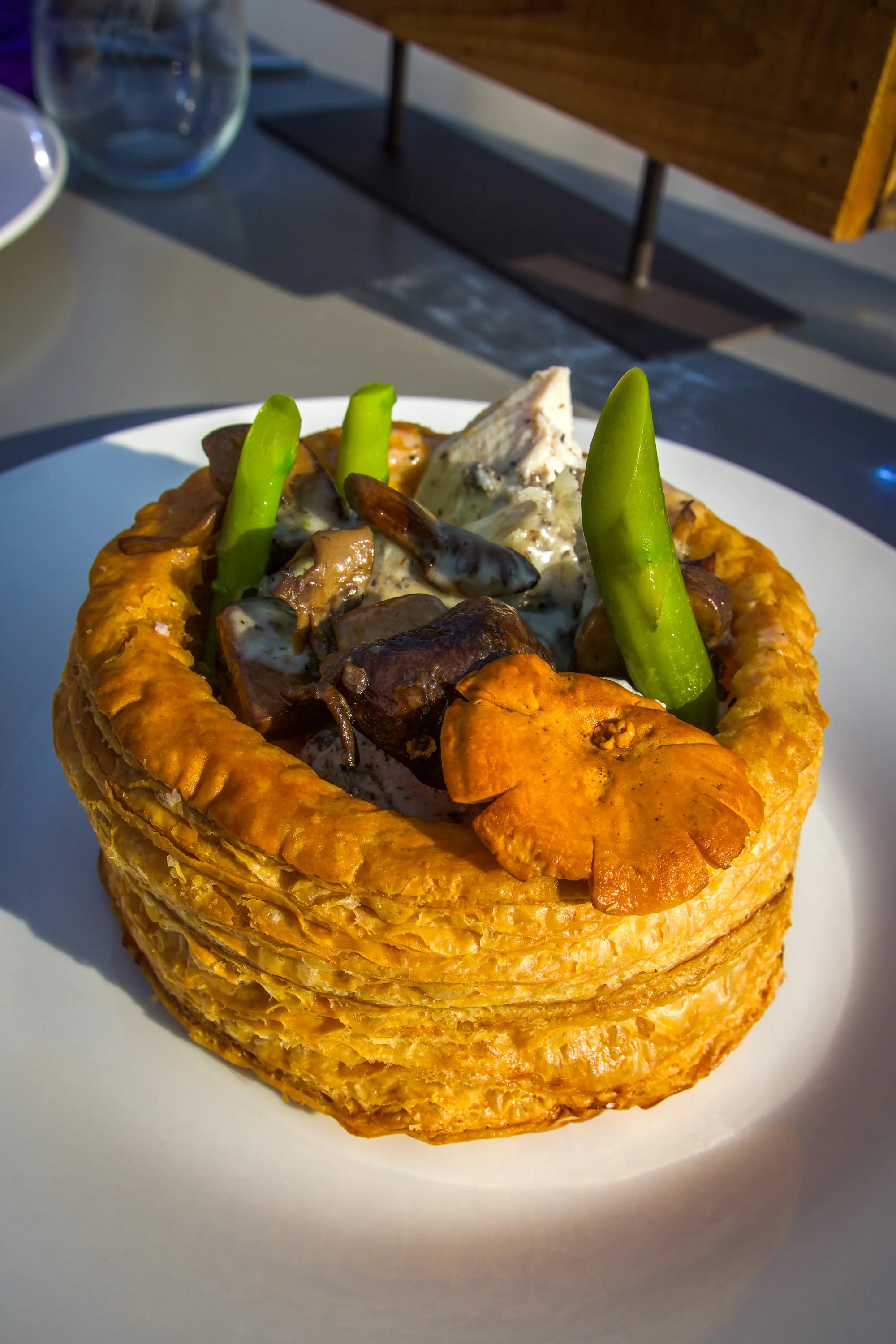 Chef Jordanโs Chicken vol au vent, tarragon and truffle sauce, wild mushrooms, and asparagus.