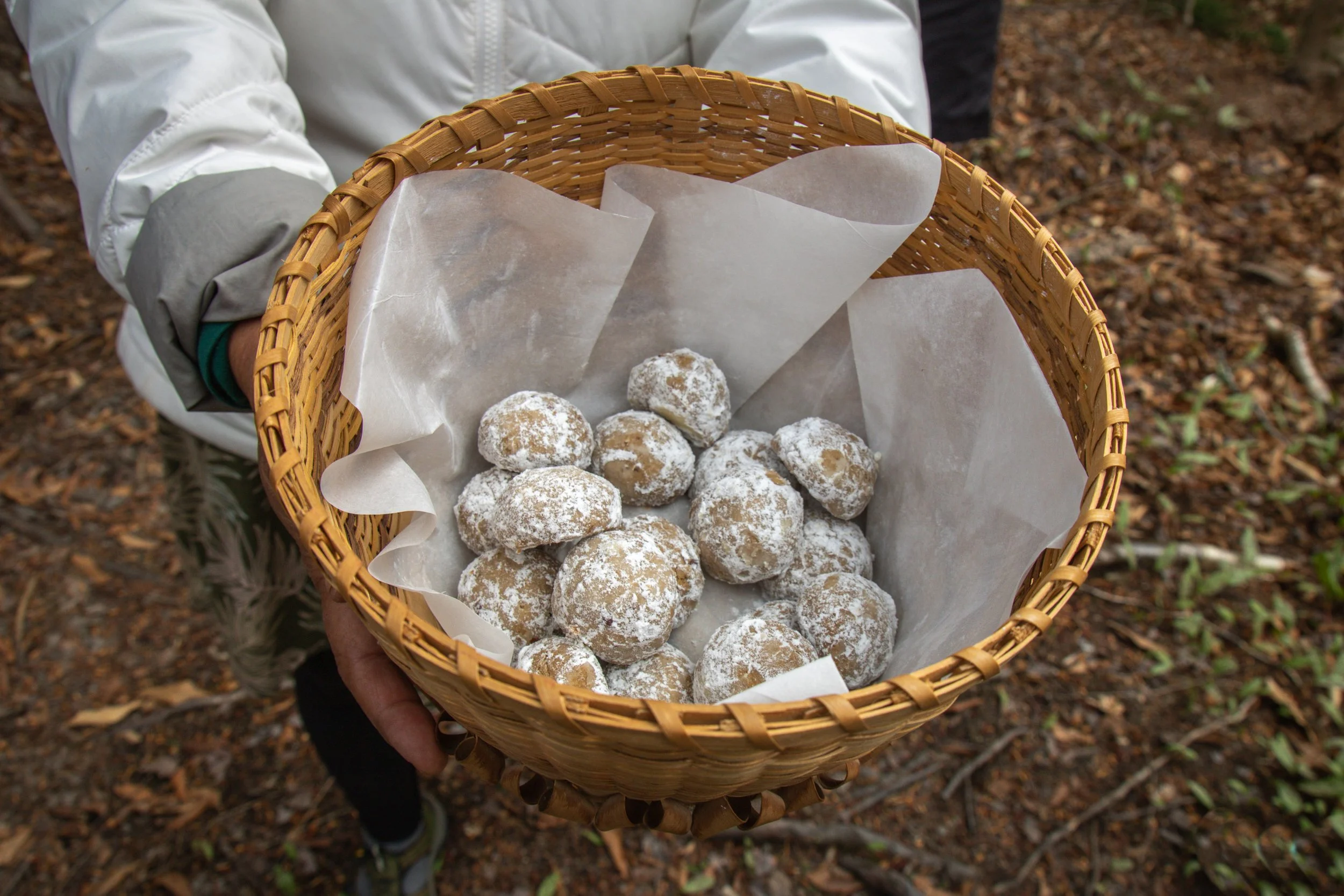 As we walked, Cecelia and Anthony introduced us to forest friends: Trout Lily, Blue Beaded Lily, and several conifers. We learned to look closely, taste carefully, and, importantly, not to forage directly next to the path. (Cecelia shared the tip with a smile and a nod to dogs and their habits.) Cecelia and Anthony teach using a “two-eyed seeing” approach, blending Indigenous wisdom with Western science. We sipped Balsam Fir tea, naturally rich in vitamin C, and nibbled on acorn shortbread made from low-tannin Bur Oak acorns.